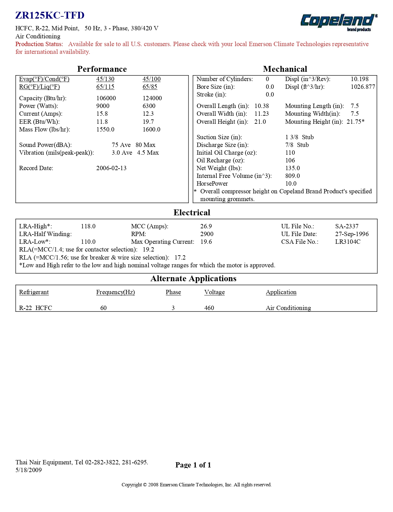 Máy nén ZR125KC–TFD–522 là một dạng máy nén xoắn ốc của Copeland, sản xuất tại Thái Lan.